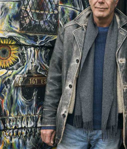 Made of heavy duty top grain hide leather. Anthony Bourdain Vintage Distressed Grey Leather Jacket is manufactured from 100 genuine leather material with soft viscose lining on the inside which gives it a smooth and durable texture. Anthony Bourdain was enraptured with a knife.